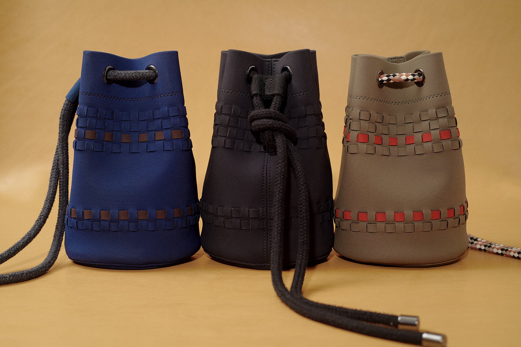 Rooted in maritime tradition, POCCA's debut collection - The DITTY - reinterprets the classic sailors’ ditty bag through material innovation and versatility. Working closely with Italian artisans, we developed a custom technical neoprene and used this to transform Italian “intreccio” into a modern statement. The multifunctional drawstring allows the Ditty to be worn cross-body, over the shoulder, or as a small accessory with two handles.